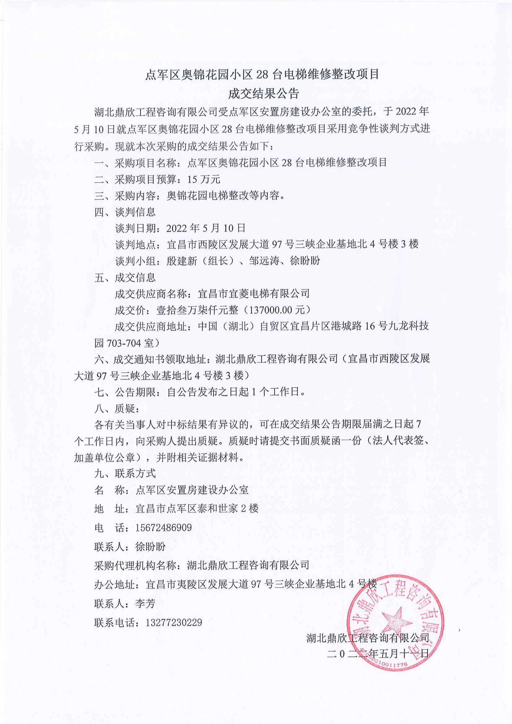 點軍區(qū)奧錦花園小區(qū)28臺電梯維修整改項目成交公告