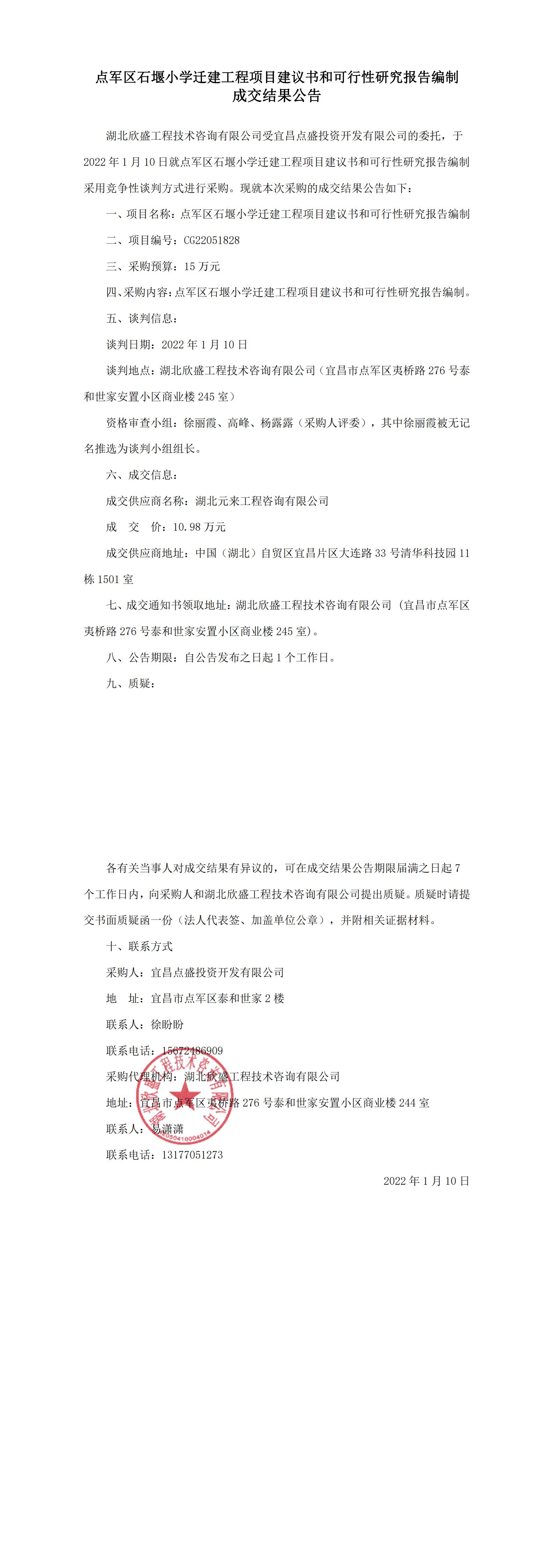 點(diǎn)軍區(qū)石堰小學(xué)遷建工程項(xiàng)目建議書和可行性研究報告編制成交結(jié)果公告