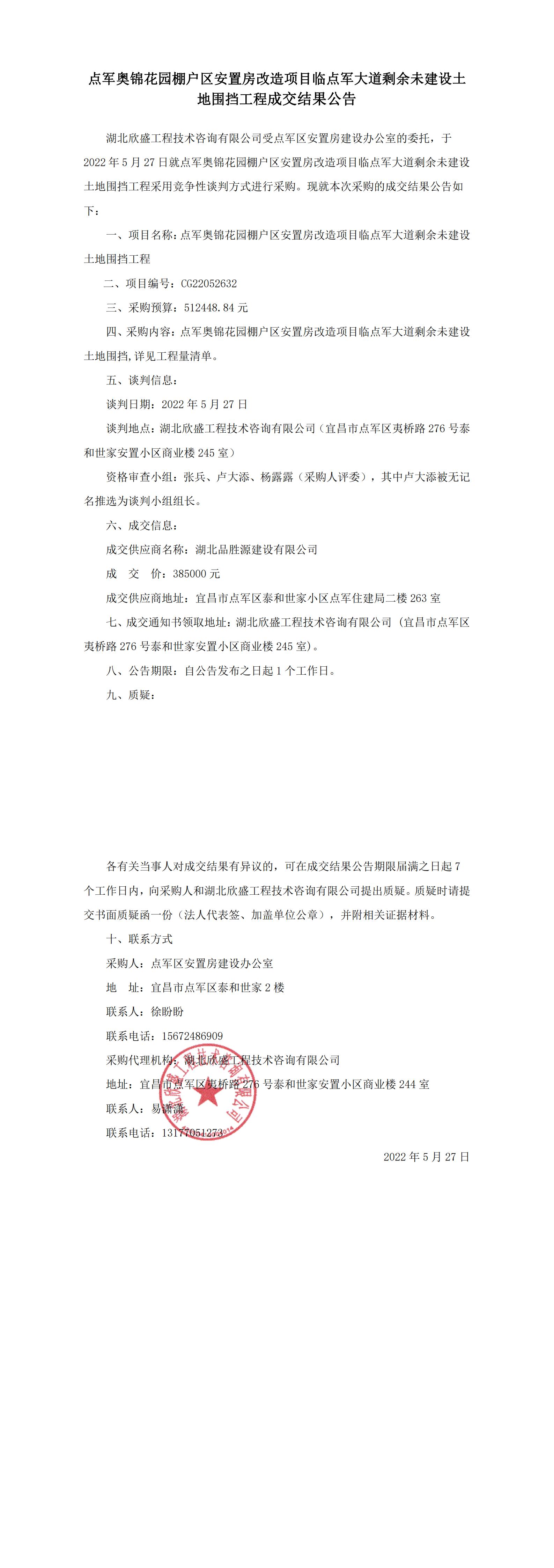 點軍奧錦花園棚戶區(qū)安置房改造項目臨點軍大道剩余未建設(shè)土地圍擋工程成交結(jié)果公告