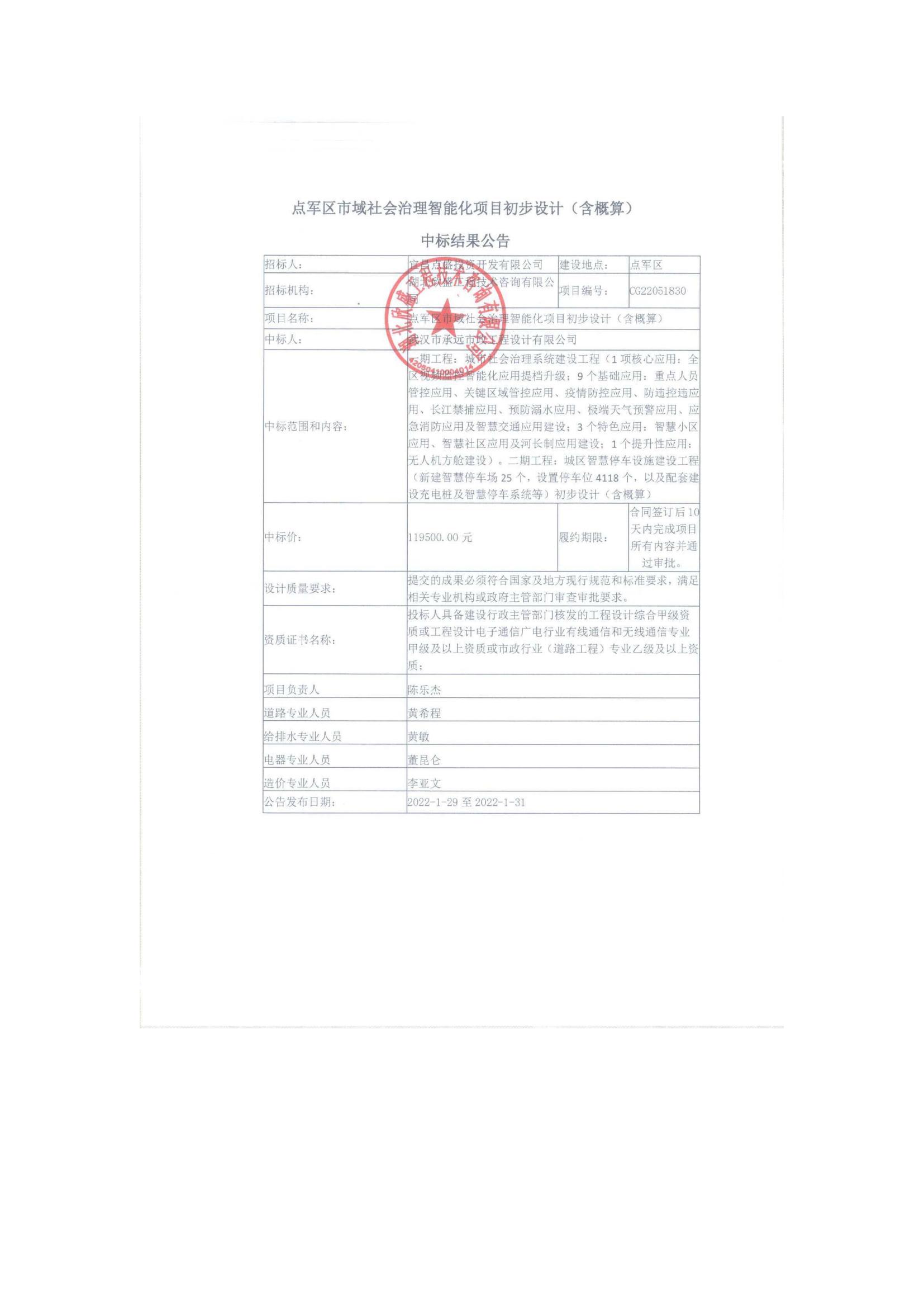 點(diǎn)軍區(qū)市域社會治理智能化項(xiàng)目初步設(shè)計(jì)(含概算)中標(biāo)結(jié)果公告