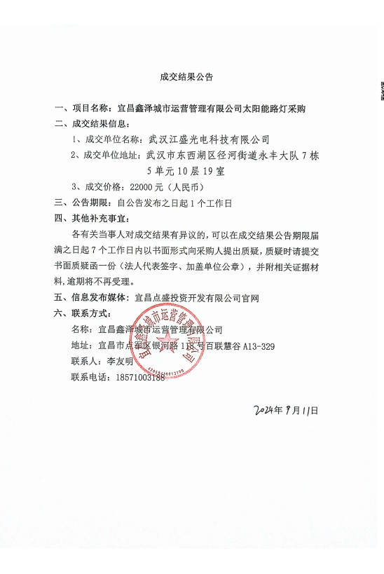 宜昌鑫澤城市運(yùn)營(yíng)管理有限公司太陽(yáng)能路燈采購(gòu)項(xiàng)目成交公告