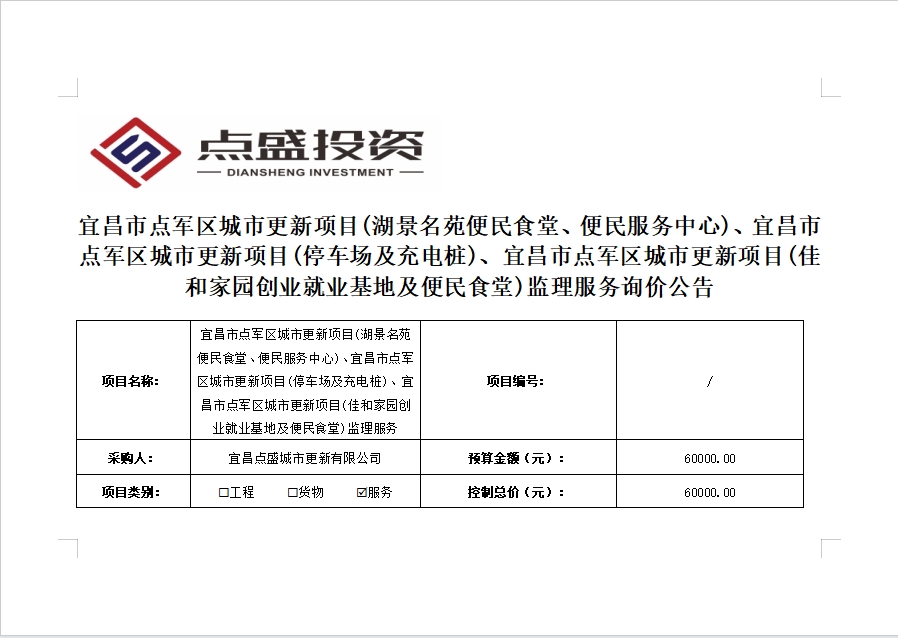 宜昌市點軍區(qū)城市更新項目(湖景名苑便民食堂、便民服務中心)、宜昌市點軍區(qū)城市更新項目(停車場及充電樁)、宜昌市點軍區(qū)城市更新項目(佳和家園創(chuàng)業(yè)就業(yè)基地及便民食堂)監(jiān)理服務詢價公告