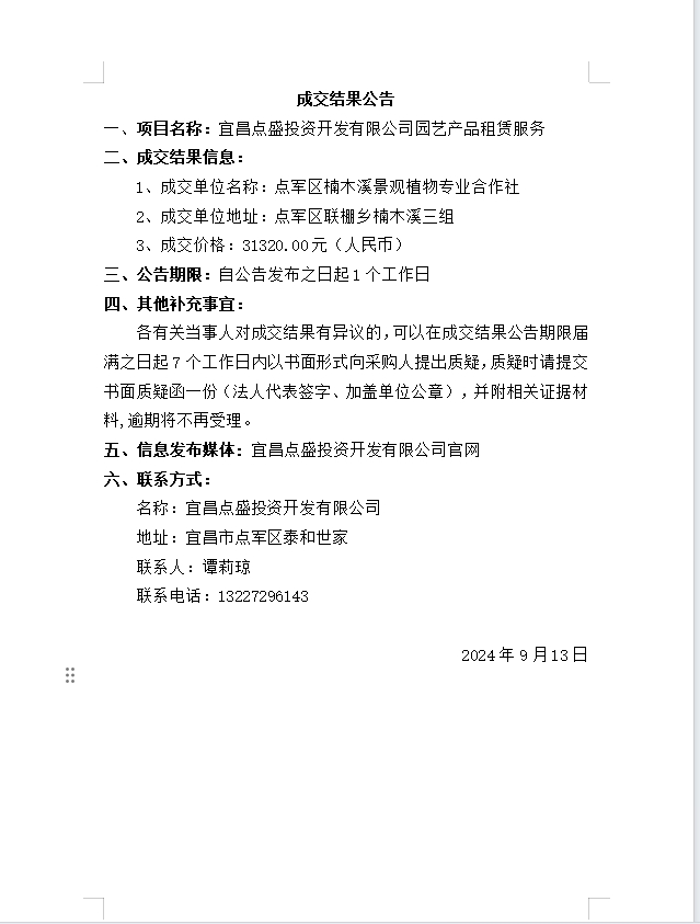 宜昌點(diǎn)盛投資開發(fā)有限公司園藝產(chǎn)品租賃服務(wù)成交公告