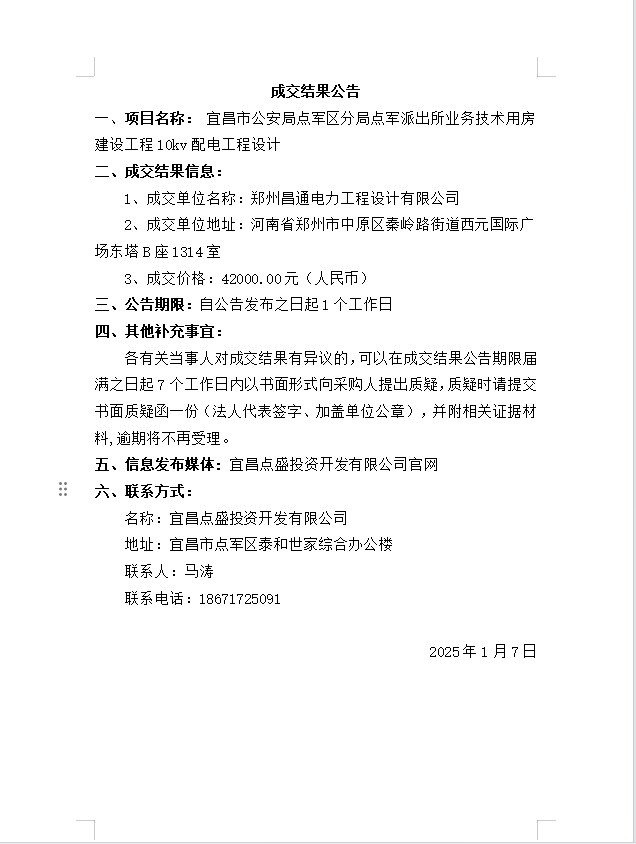 宜昌市公安局點軍區(qū)分局點軍派出所業(yè)務技術用房建設工程10kv配電工程設計成交公告