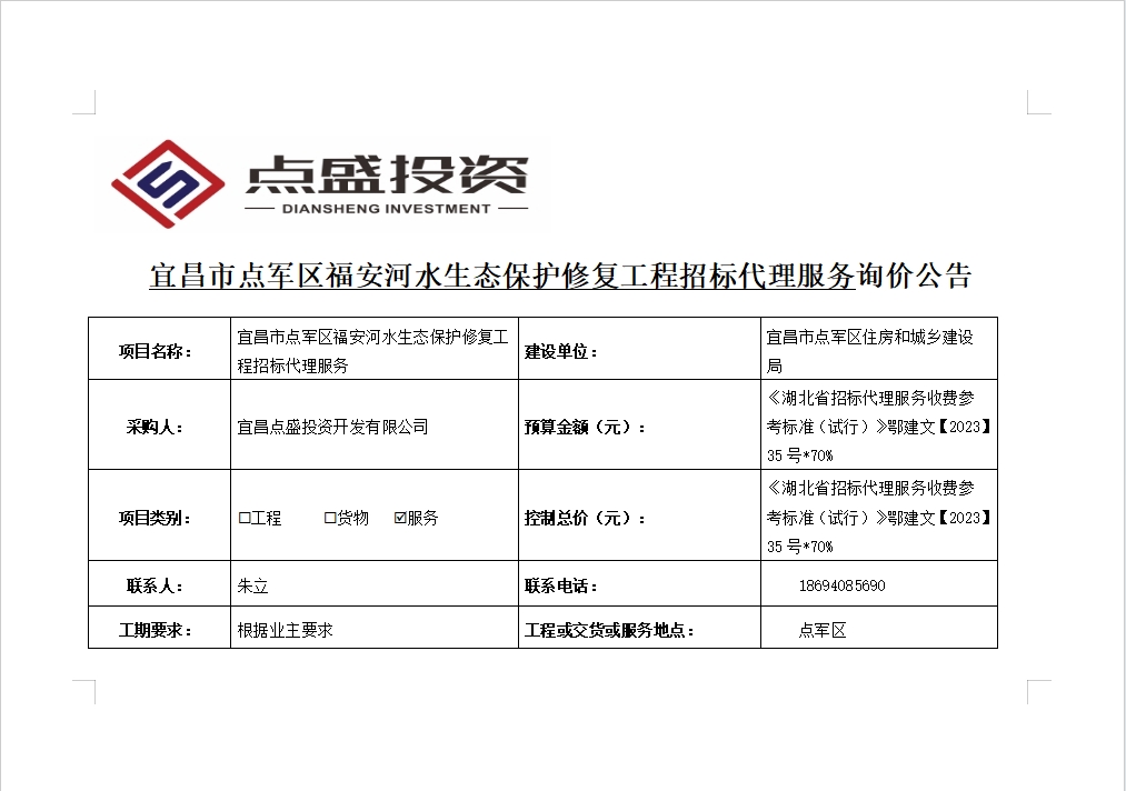 宜昌市點軍區(qū)福安河水生態(tài)保護(hù)修復(fù)工程招標(biāo)代理服務(wù)詢價公告