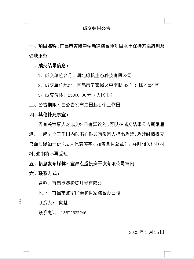 宜昌市夷陵中學(xué)新建綜合樓項目水土保持方案編制及驗收服務(wù)成交公告