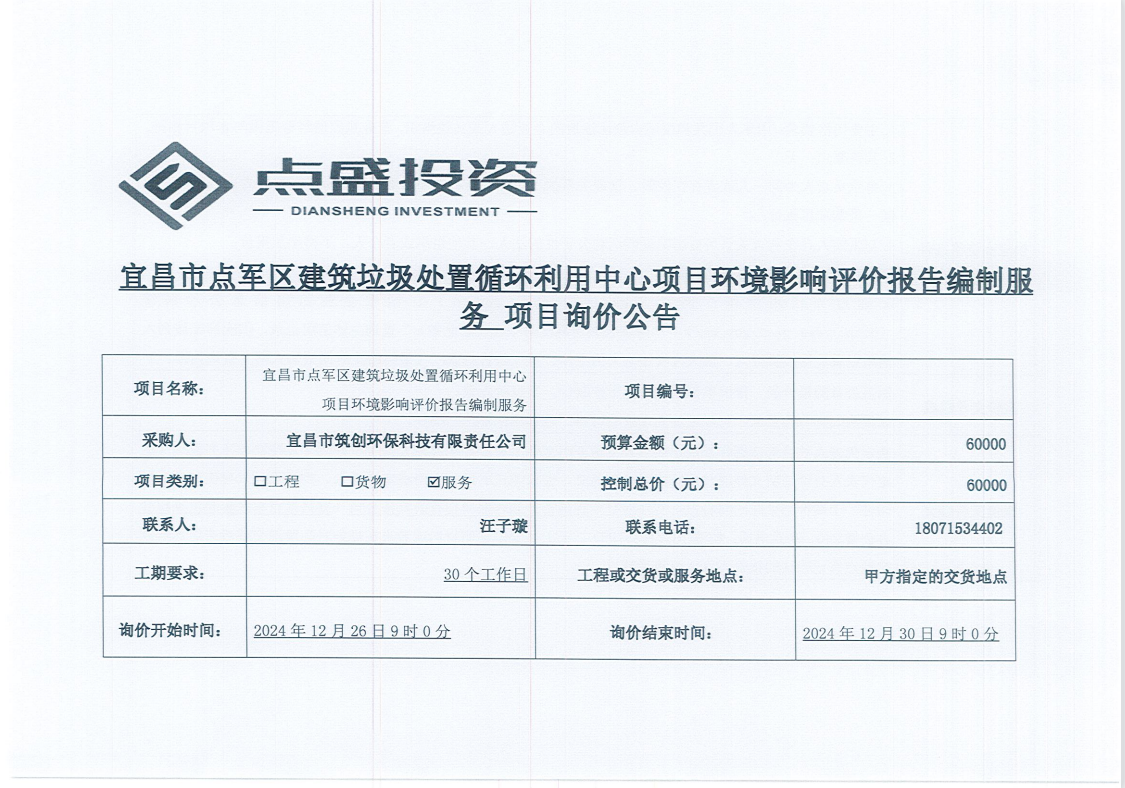 宜昌市點(diǎn)軍區(qū)建筑垃圾處置循環(huán)利用中心項(xiàng)目環(huán)境影響評(píng)價(jià)報(bào)告編制服務(wù)項(xiàng)目詢價(jià)公告